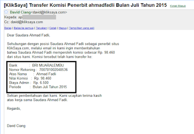 Setelah 2 Bulan memasang iklan dari kliksaya. (Penghasilan pertama baca disini) Akhirnya saya menerima kembali upah dari pemasangan iklan ini. Nominalnya memang berkurang,tapi yang dtransfernya malah bertambah daripembayaran bulan pertama. Bulan pertama Nominal saya lebih besar dariini,namun ada denda sebesar 50.000 yang disebabkan oleh ulah saya. Nah bulan keduasaya mencoba lebih bermain sesuai aturan. Alhamdulillah meski nominalnya sedikit,tapiyang dibayar tidak dipotong Denda..
