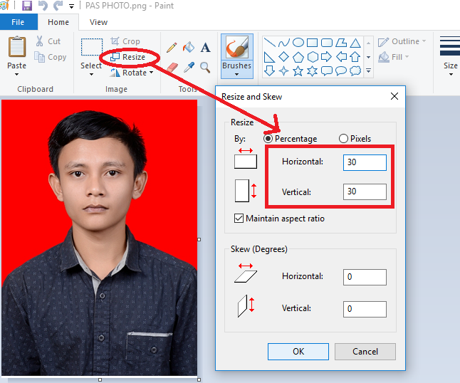 Pada Aplikasi Paint, silakan klik menu Resize dan ubah ukuran pada percentage menjadi 30 (jika ukuran masih melebihi, bisa diganti menjadi 25 atau dibawahnya) Lalu klik OK