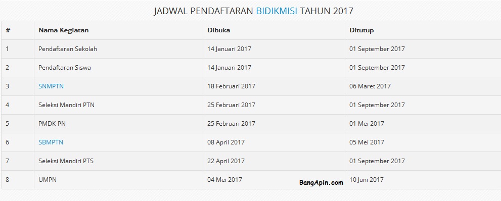 - SNMPTN: 18 Februari – 6 Maret 2017