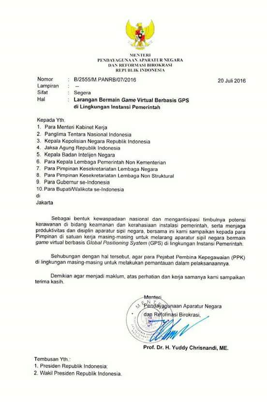 Surat Edaran bernomor: No: B/2555/M.PANRB/07/2016 tertanggal 20 juli 2016 dengan tegas memeberitahukan kepada seluruh Pimpinan Di Satuan kerja masing-masing agar melarang Para ASN bermain Game virtual berbasis GPS di lingkungan Instansi Pemerintah.