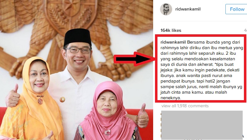Baru-baru ini, Kang Emil mengunggah photo di Instagramnya, Photo yang terlihat akrab antara Kang Emil, Ibu serta Mertuanya. Tidak ada yang salah memang, tapi jika kita membaca captionnya, maka akan terlihat jurus jitu yang mungkin digunakan Kang Emil saat mendekati Ibu Cinta (Istri Kang Emil)